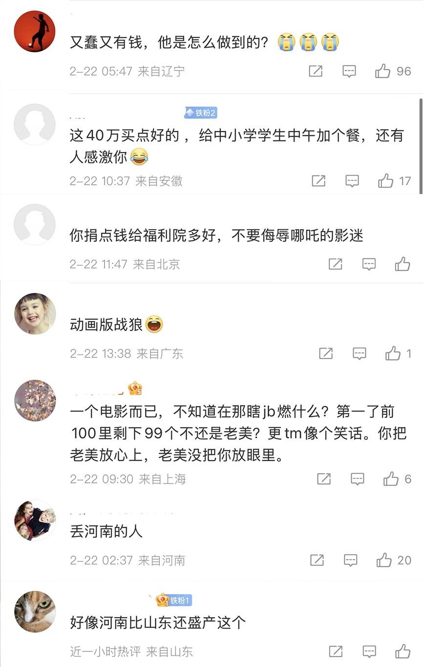 2月21日,河南郑州。河南小伙一天花费40万元包下16家电影院,免费请全城的人看《哪吒2》 2月19日,广东。女子为助力《哪吒2》票房冲榜,花费100万元,包场请农村老人小孩看《哪吒2》 网友表示:你们捐点钱给福利院多好,或者捐给中小学的学生们加个餐。