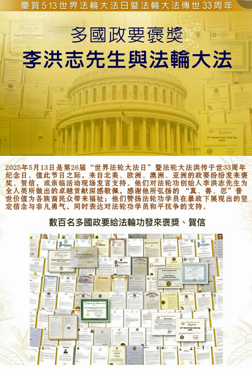 庆贺5.13世界法轮大法日暨法轮大法传世33周年 #多国政要褒奖李洪志先生与法轮大法
