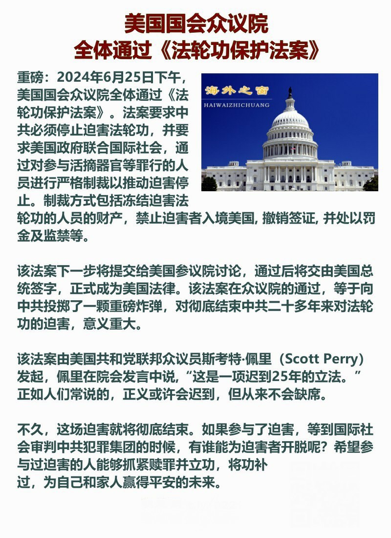 美国国会众议院全体通过《法轮功保护法案》