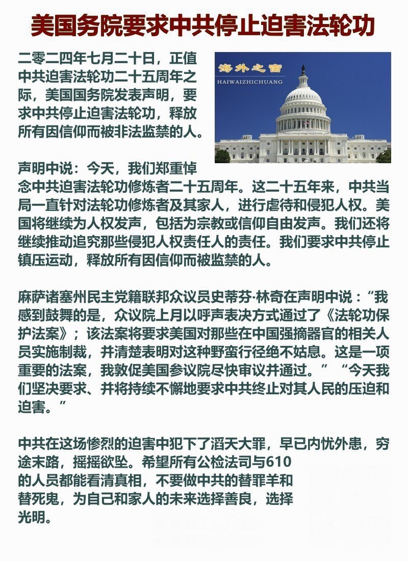 美国务院要求中共停止迫害法轮功