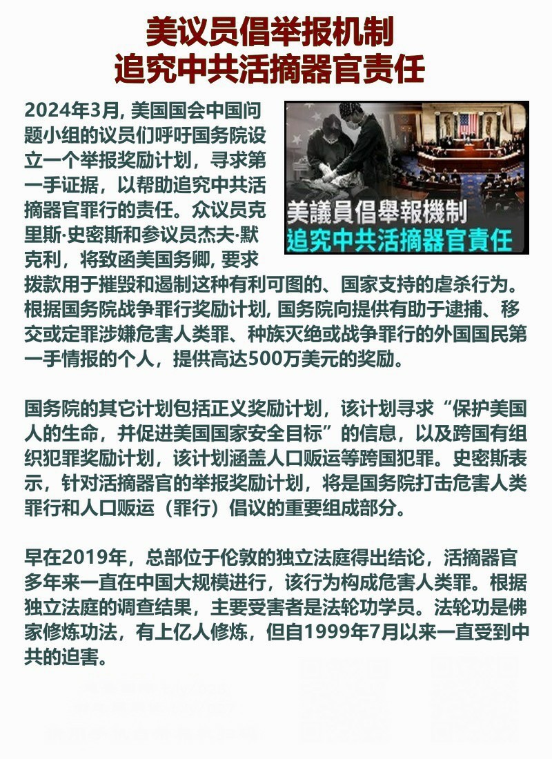 美议员倡举报机制 追究中共活摘器官责任