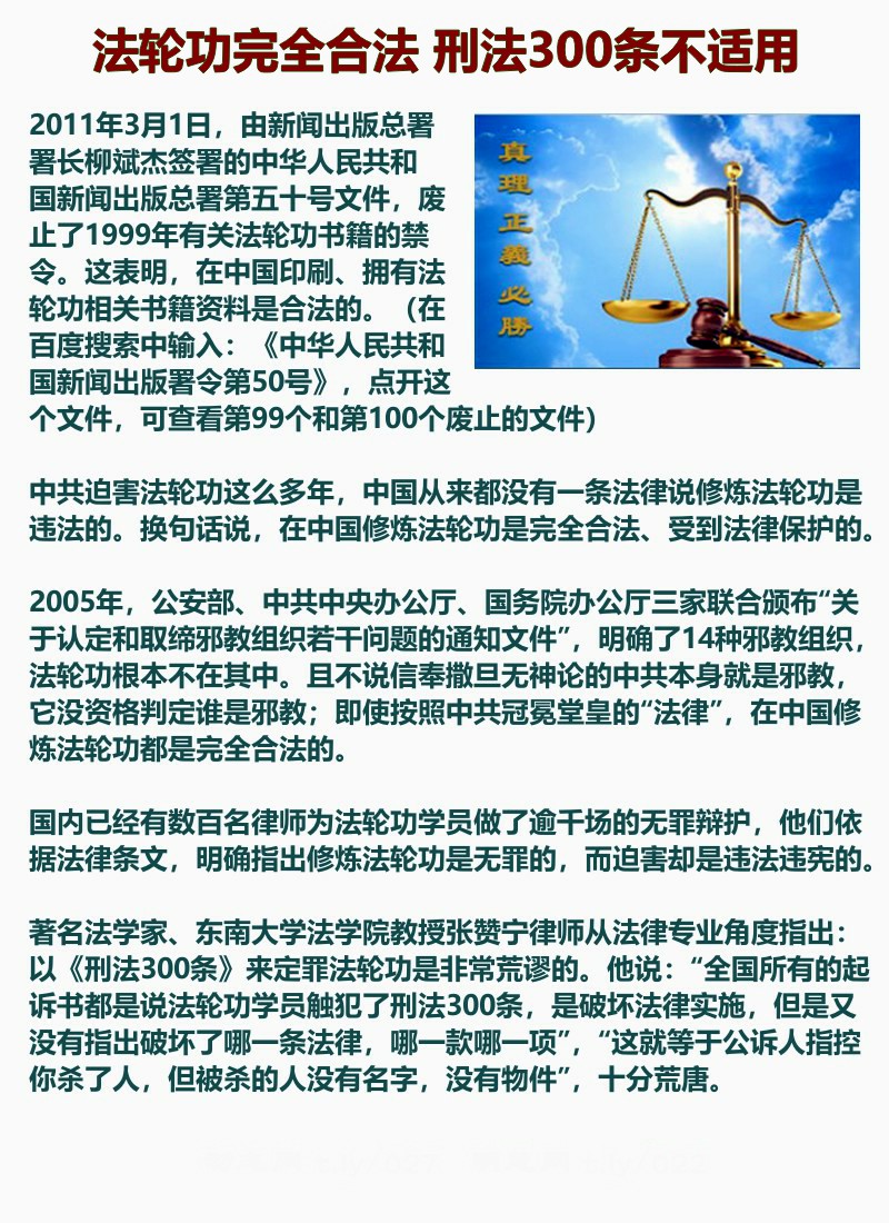 法轮功完全合法 刑法300条不适用