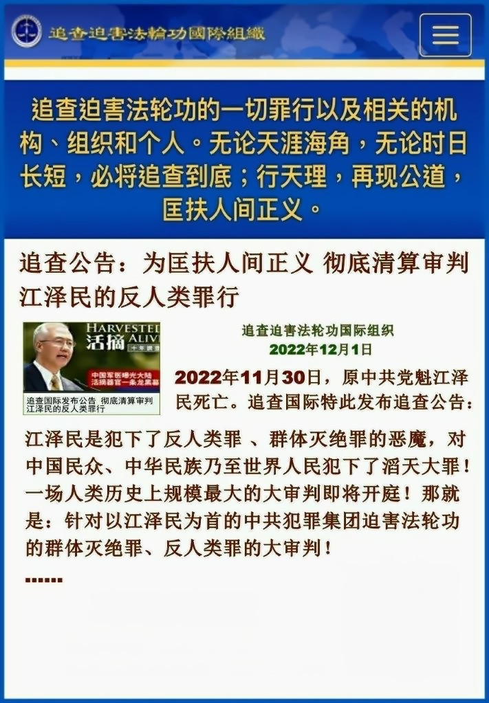 追查公告:为匡扶人间正义 彻底清算审判江泽民的反人类罪行