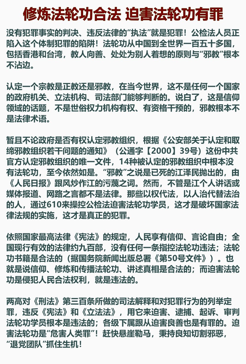 修炼法轮功合法 迫害法轮功有罪